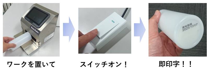 ![]() 特長 ・産業用インクジェットの性能を卓上で実現 コンベア等の搬送装置も、プリンターをスライドさせるような動作も不要 ワークをステージの上に置いて、スイッチを押すだけで立体物への直接印字が簡単に出来ます。 ・速乾性黒インクを用意し、段ボール、紙、木材等の浸透面は勿論、 金属、樹脂、フィルム等、比浸透面の様々なワークにの対応可能。 インクの密着が気になるお客様は対象のワークへの印字テストも行いますので、安心してご採用頂けます。 |